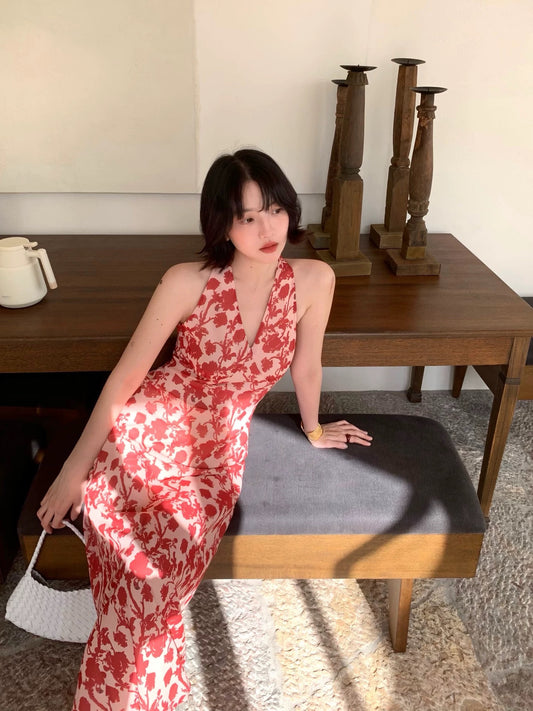 Homemade by Jiuwu: [Candied Rose] French Retro Summer Floral Print Halter Neck V-Neck Long Dress Vacation Dress