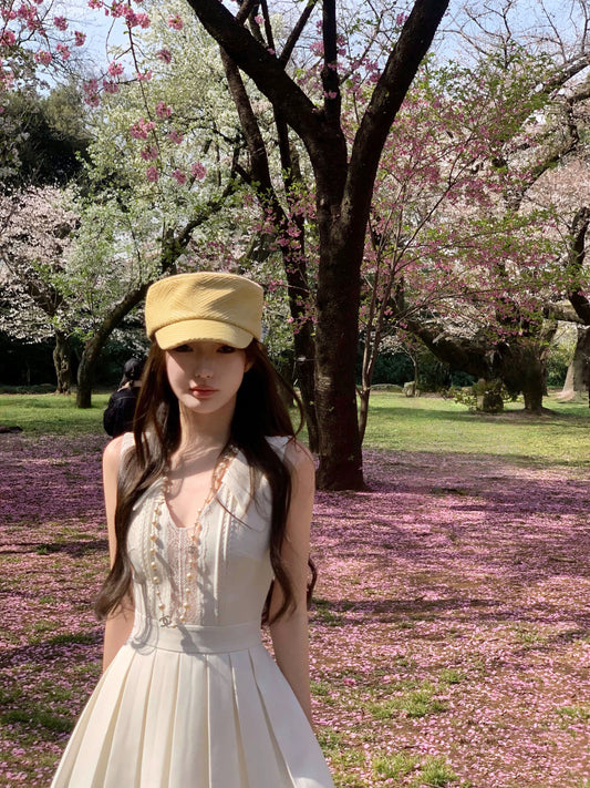 [In Stock] CHICYOU Lux Series White Lace-Trimmed V-Neck Pleated Dress