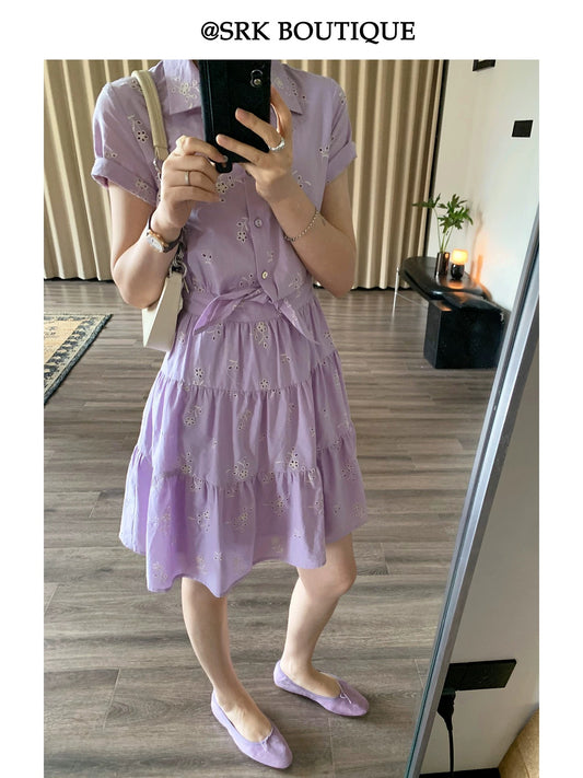SRK French Embroidered Dress: Gentle V-neck, elegant, high-waisted, slimming A-line casual short shirt dress.