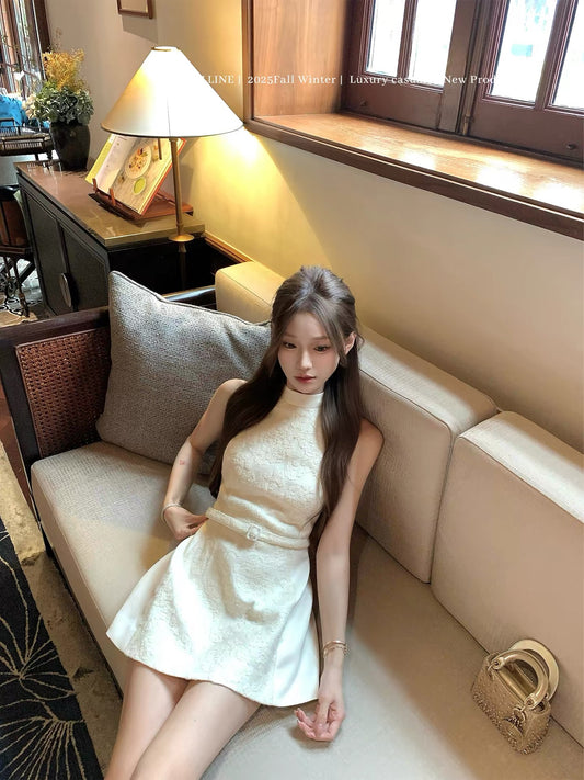 YUJIAHAN "Wool" Elegant Sweater Shawl + Stand Collar Sleeveless Dress Set for Women