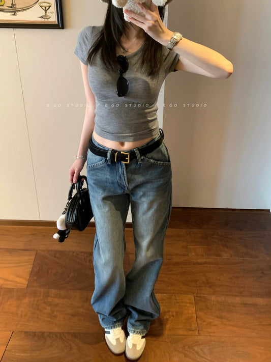 e go studio Blue Washed Distressed Straight Leg Mid-Rise Jeans for Women - Stylish, Casual, and Versatile Long Pants