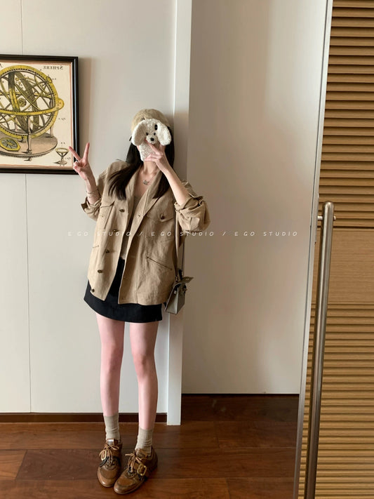 e go studio linen/tencel cotton oversized retro collar spring coat, Korean style slimming loose coat for women