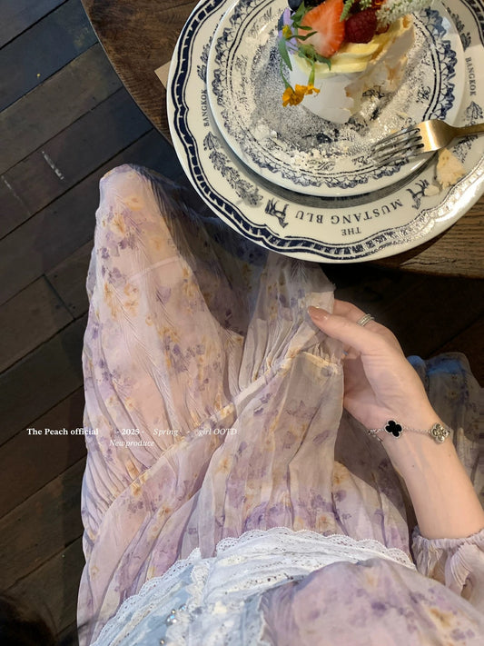 thepeachofficial【Feniz Garden】French Purple Lace Floral Long-Sleeved Dress for Women (Spring)