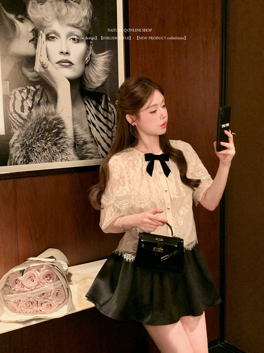Yang Xiaojuan's French retro-style lace blouse/shirt, cape-style faux two-piece white top with bow.