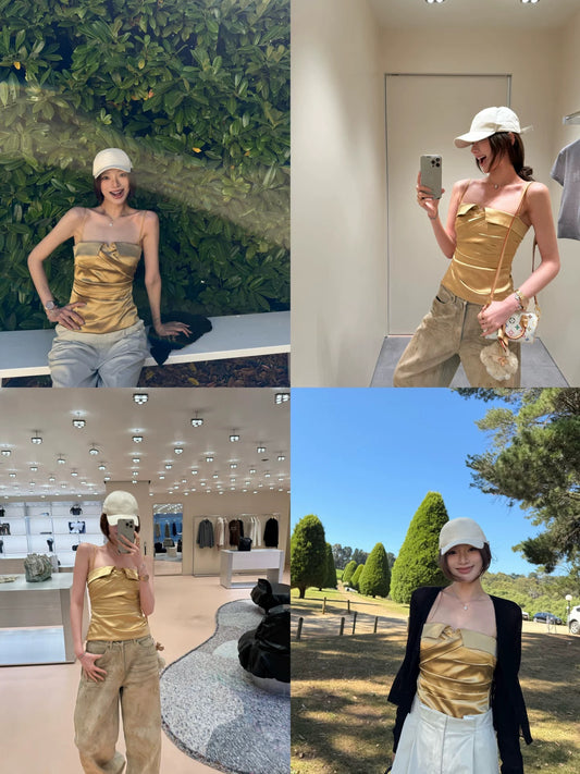 yangzifan vtg Luxury Elegant Camisole Vest for Women, Summer Retro Asymmetrical Gold Strapless Top