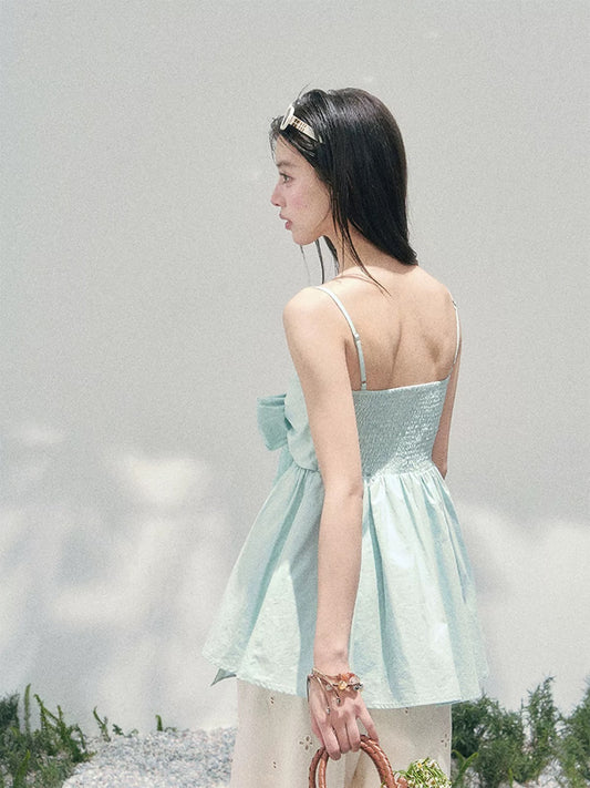 AOMALM's "Blue Whispers" Off-the-Shoulder Bow-Tie Babydoll Top for Women, Slimming Spring Style
