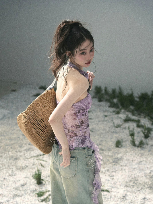 AOMALM's "Bauhinia Blossom" Irregular Slightly Sheer Thin Ribbon T-Shirt for Women, Springtime Pure and Alluring Halter Neck Top