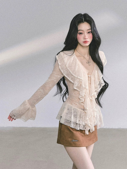 AOMALM's "London Student" % Pure and Sexy Long-Sleeved Lace Hollow-Out T-Shirt Women's Autumn Ruffle Top