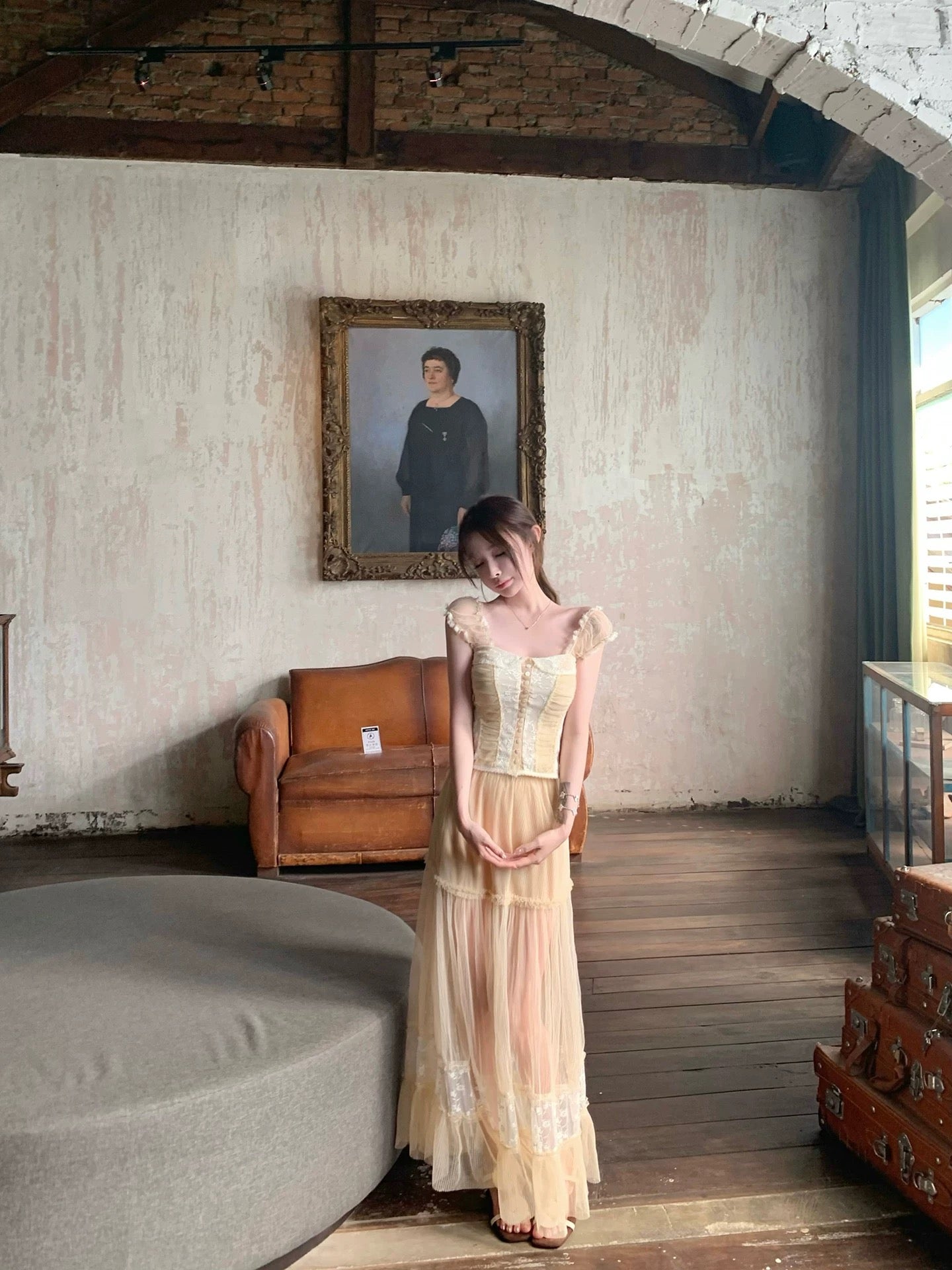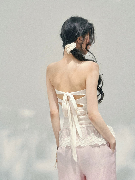 AOMALM's "Dazed Muse" sheer lace cutout thin strapless T-shirt for women, perfect for early spring and a sexy look.