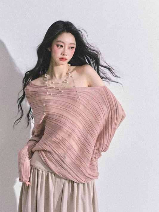 AOMALM's "Gentle Sister" French-style gentle style off-shoulder hollow knit sweater for women, autumn top.