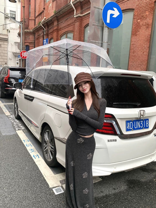 Kumikumi Hot Girl Style Dark Gray V-Neck Long Sleeve Slim Fit T-Shirt Women's Autumn and Winter Slimming Midi Skirt Two-Piece Set