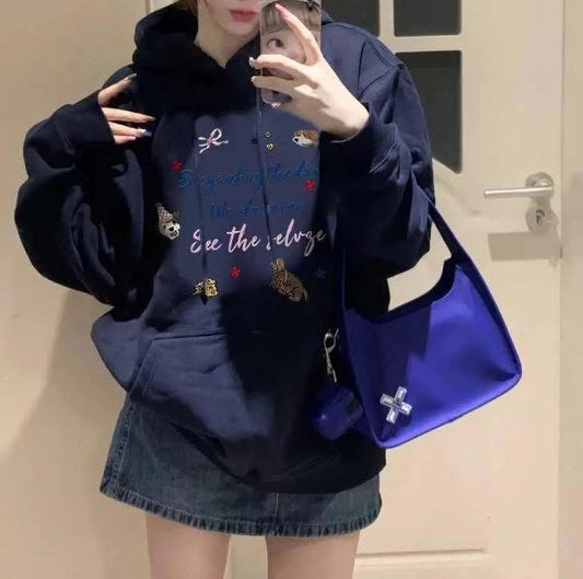 Women's pure cotton navy blue hooded sweatshirt, autumn and winter, fleece-lined, thick, loose, Korean style, relaxed and sophisticated, spring and autumn top.