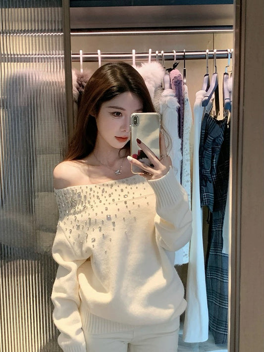 Off-the-shoulder white moonlight rhinestone long-sleeved knit sweater for women, autumn and winter, exquisite and high-end, pure and sexy loose top.