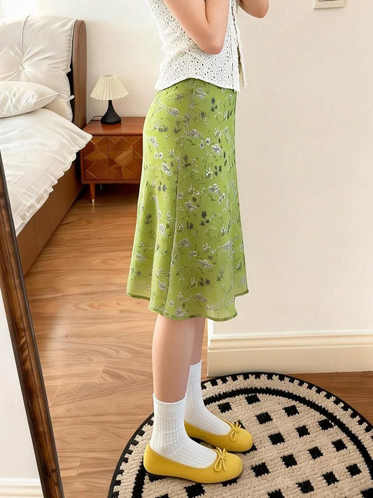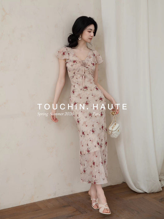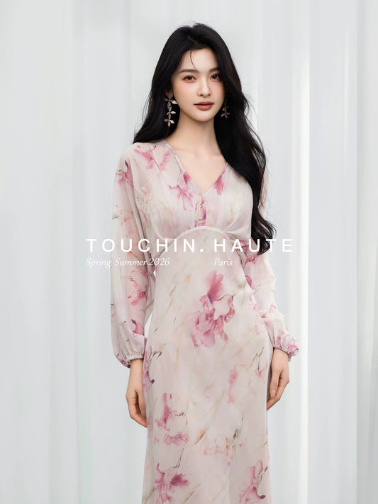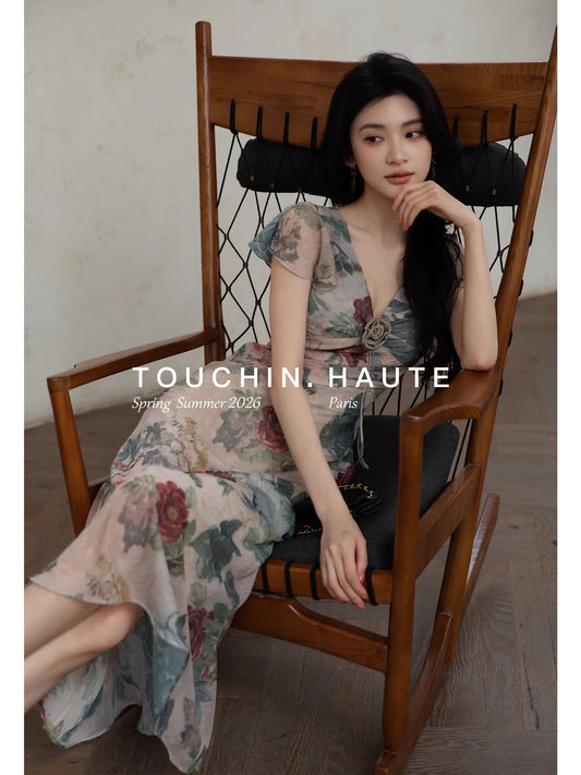 Syeee Wind Kissing Flower Eaves Heavy-duty Pleated Floral Dress Women's Spring/Summer French Romantic Style Flowing Skirt