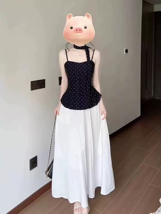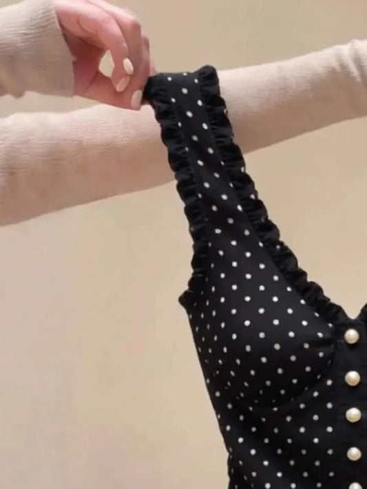 Export label cut-out bra with breast pads, French style polka dot vest, slim fit top.