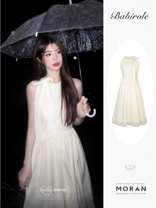 Shu Hulei White Butterfly French Style Bow Tie Color Block Long Knitted Dress for Women (Winter)