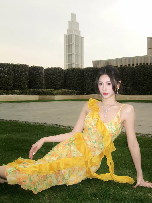 Good Job: 【Floral Stroll】French Yellow Floral Print Sundress, Women's Beach Vacation Mesh Maxi Dress