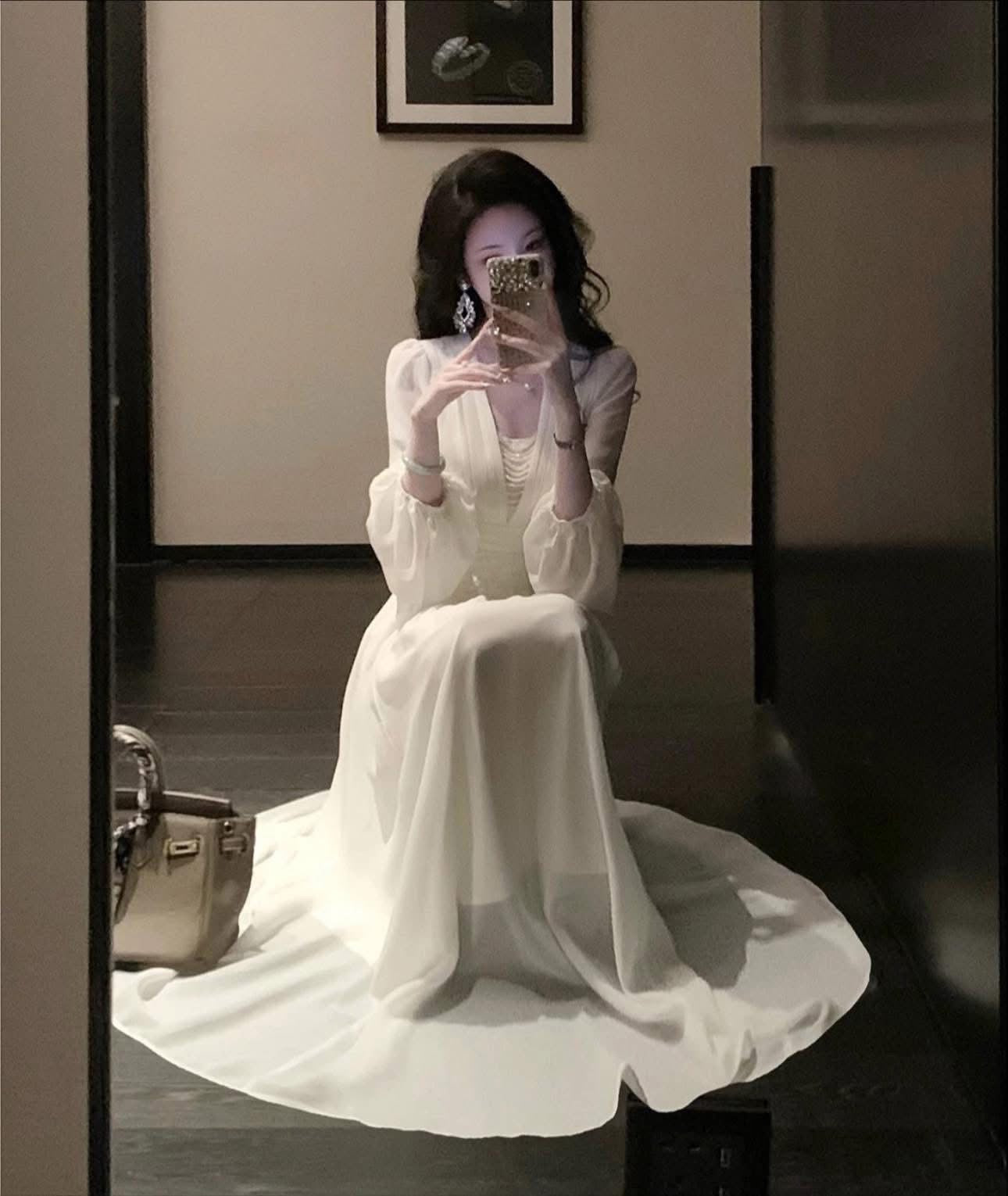 Sun Yaqiao's Summer Three-Quarter Slim Fit Lace Trim Pearl Chiffon Lantern Sleeve Dress