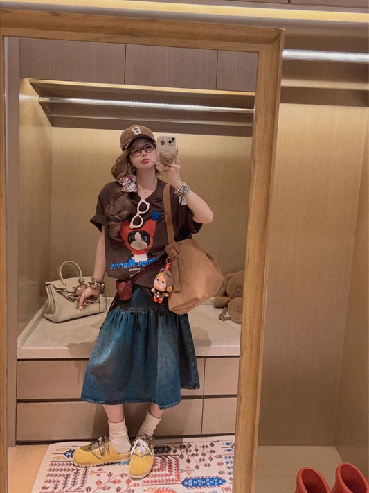 Women's new summer style dark blue retro denim shorts, stretchy, loose, high-waisted, slimming A-line bodycon hot pants, Instagram style.