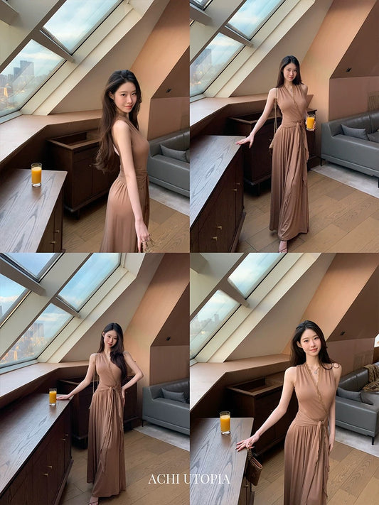 Korean-style sexy striped halter top for women, new spring 2026 style, slim fit, sleeveless design.