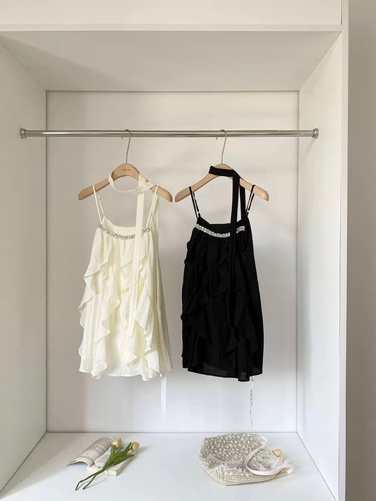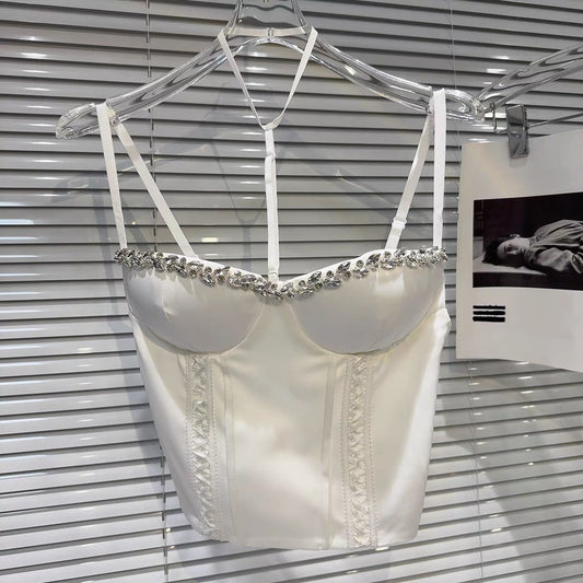 [In Stock] 2026 Spring New Hot Girl Socialite Rhinestone Beaded Trim Strappy Fishbone Bra Pad Halter Neck Tank Top