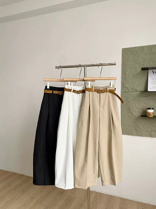 Korean style retro simple casual trousers for women, new spring 2026 style, high-waisted, slimming, loose-fitting curved trousers with belt.