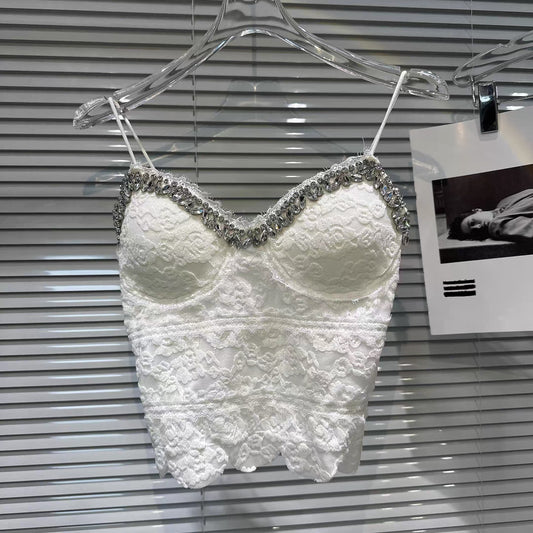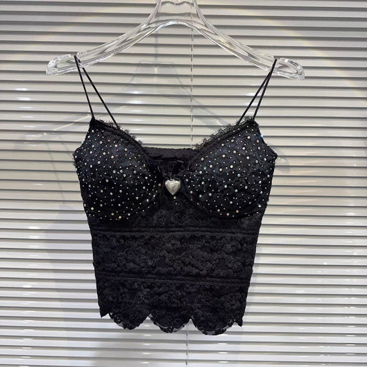 [In Stock] 2026 Spring New Style-Style Sexy Lace Camisole with Rhinestone Trim and Slim Fit with Bra Pads