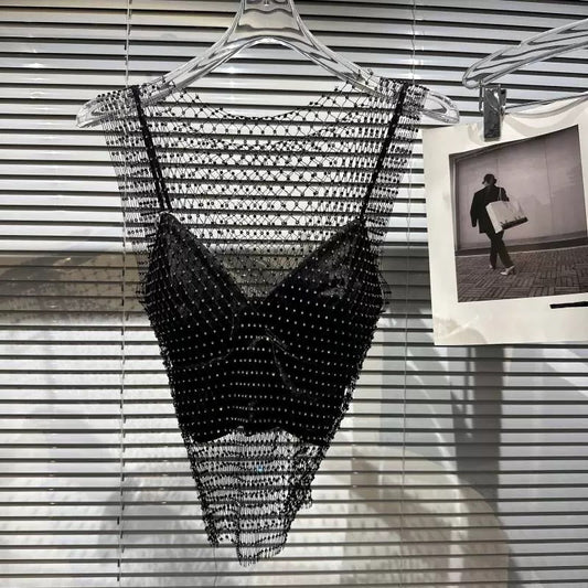 [In Stock] 2026 Fashion Show Sexy Socialite Mesh Rhinestone Lined Heavy-Duty Tank Top Two-Piece Set