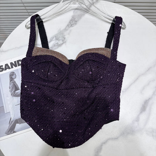 [In Stock] 2026 Spring New Arrival-Style Embroidered Sequin Tweed Herringbone Waist-Cut Cropped Tank Top