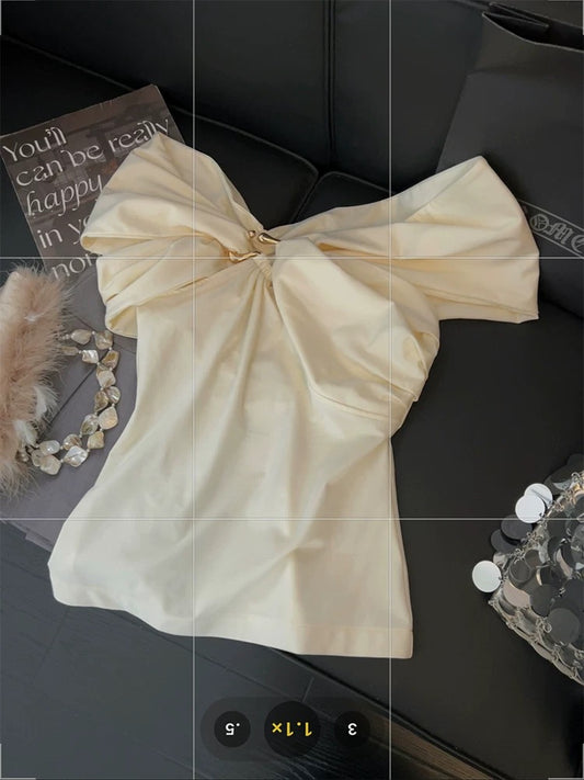 Irregular knotted off-shoulder top for women, metallic patchwork and pleated design, 2025 summer elegant and gentle style vest.