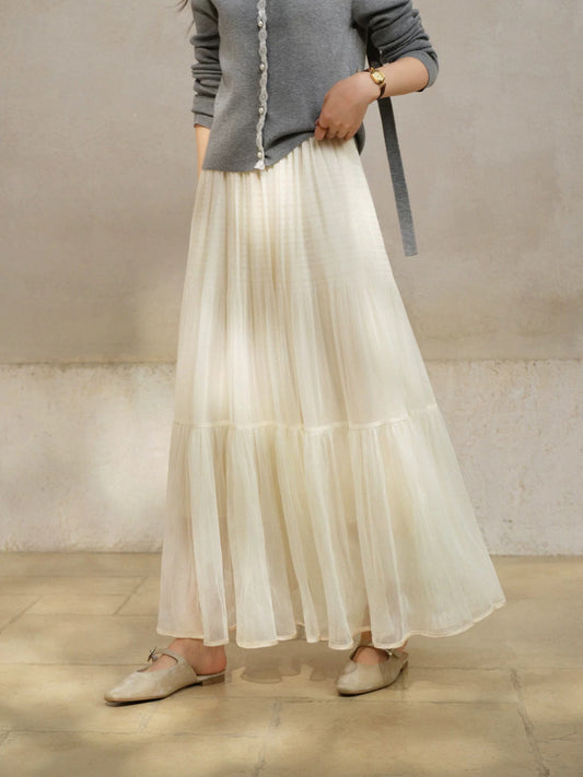 SLEEPYBUNNY High-Waisted Full-Sleeve Satin Pleated Midi Skirt for Women, Winter Slimming Mesh A-line Maxi Skirt