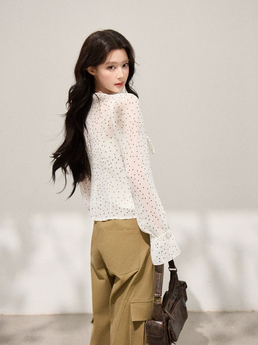 Xie Burou, Ruffled V-neck Polka Dot Chiffon Blouse for Women, Spring Style, Korean Slim Fit, Fashionable and Versatile Top