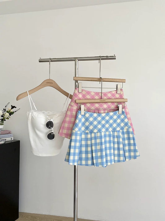 Sweet plaid blue pleated mini skirt for women, new spring 2025, Korean style, anti-exposure, high-waisted skirt.