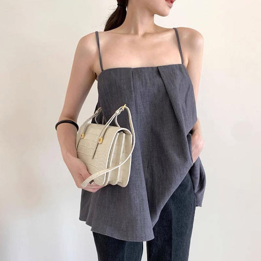 Shu Hulei, a college heiress, wears a French-style A-line vest dress with a overlapping collar and color-blocked design.