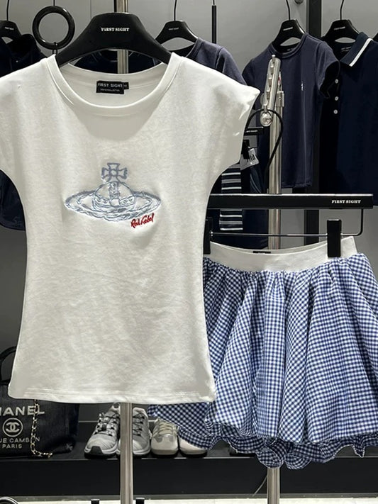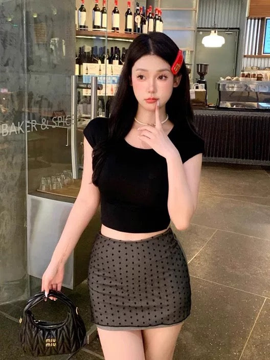 Sexy and hot red tight-fitting round neck short-sleeved T-shirt for women, summer versatile stretch waist cropped top