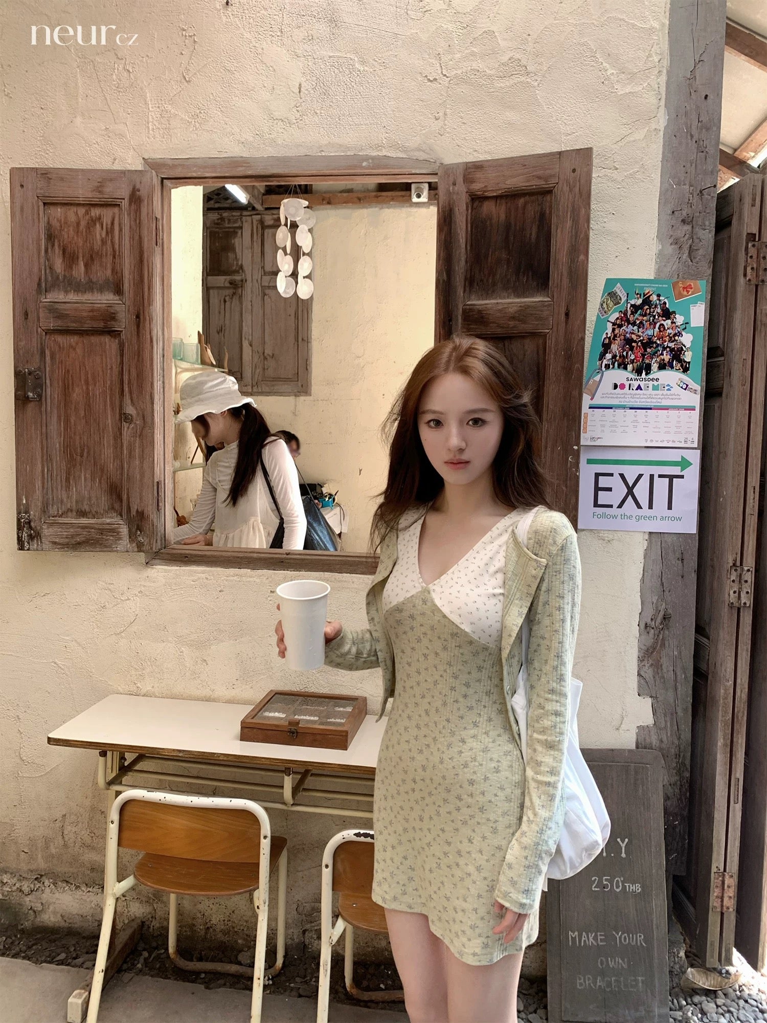 neurcz Knitted V-neck Short Color-blocked Floral Dress Women's Spring Short Cardigan Slimming Waist Two-Piece Set