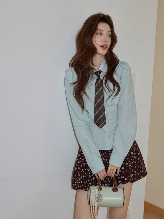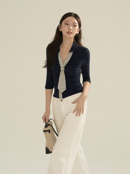 YUYUREAL Intelligent Beauty - Slim Fit Cotton Shirt with Waist-Defining V-Neck, Short Style, Unique Design.
