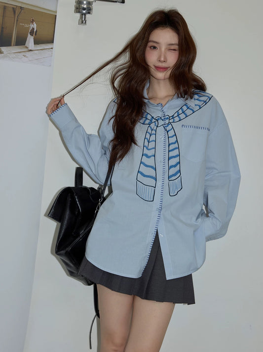 Korean style embroidered pony knit cardigan for women, with built-in scarf, new winter style for 2025, soft and youthful.