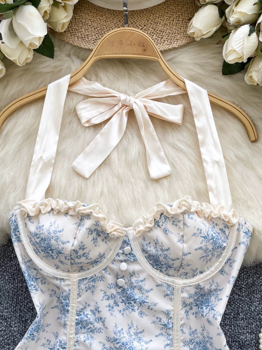 thepeachofficial【Galaxy Dream】Blue Floral Square Neck Dress/Short Skirt for Women, Summer Design