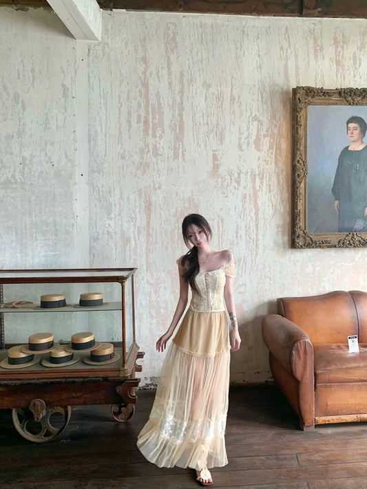 Forest-style retro lace embroidered midi skirt for women, new spring 2025 style, high-waisted, slimming A-line skirt with a large flared skirt.