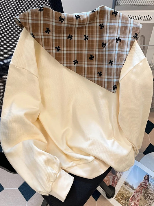Super stylish plaid patchwork sweatshirt with a faux two-piece design, perfect for autumn and casual wear, ideal for art students.