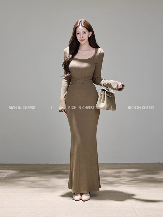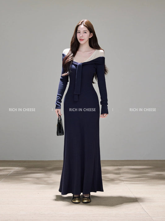 Shu Hulei Romantic Theater - Off-the-shoulder mesh-paneled long-sleeved knit dress, elegant and slim-fitting long dress for women.