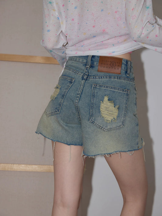 Chaochao's Gray-Green Button Shorts for Women, Summer Outerwear, American Spicy Style Denim Hot Pants, Slimming and Natural Waist