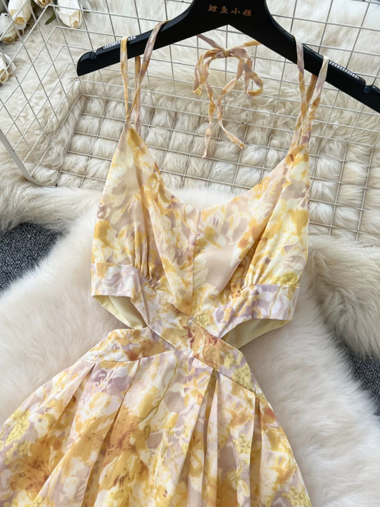 French retro floral chiffon dress for women, spring 2025, sexy hollow-out halter neck suspender maxi dress.
