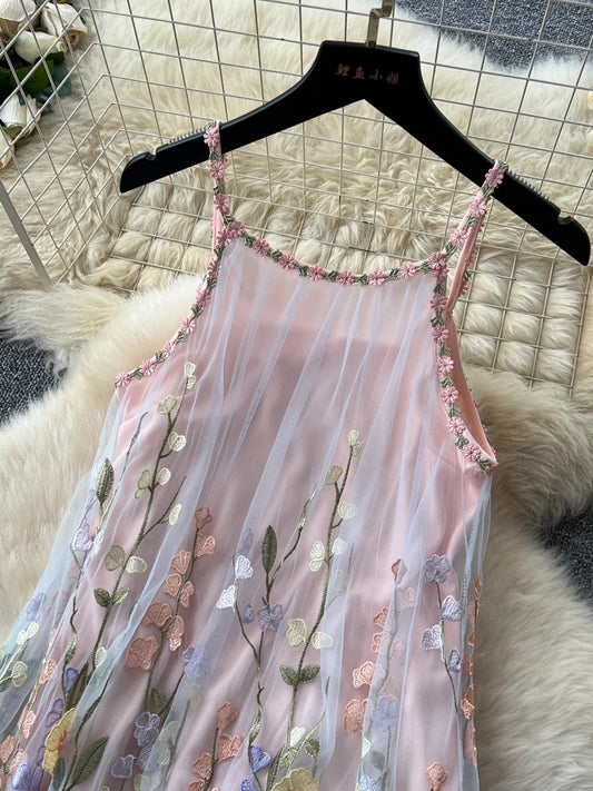 Super ethereal 3D floral embroidered mesh dress, summer sleeveless A-line elegant long dress, slimming and stunning gown.