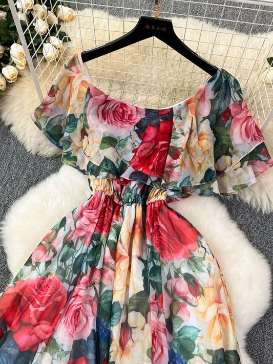 French retro floral print tea dress for women, summer style, gentle and flattering, slimming and elegant, super fairy-like chiffon dress with ruffles.