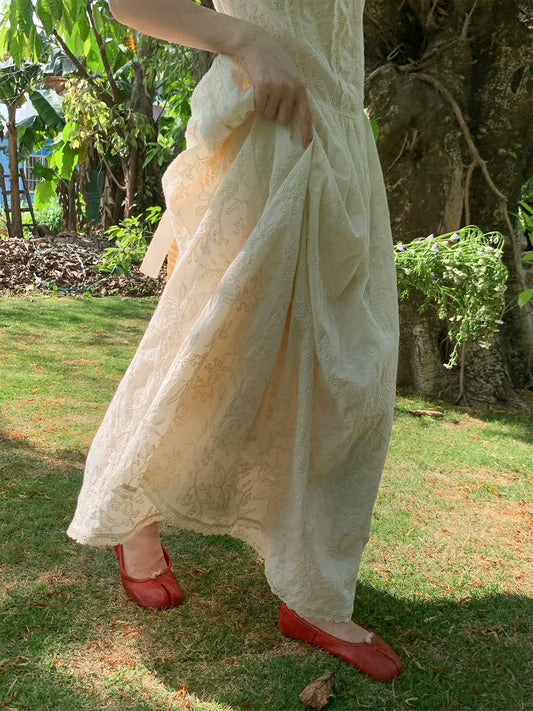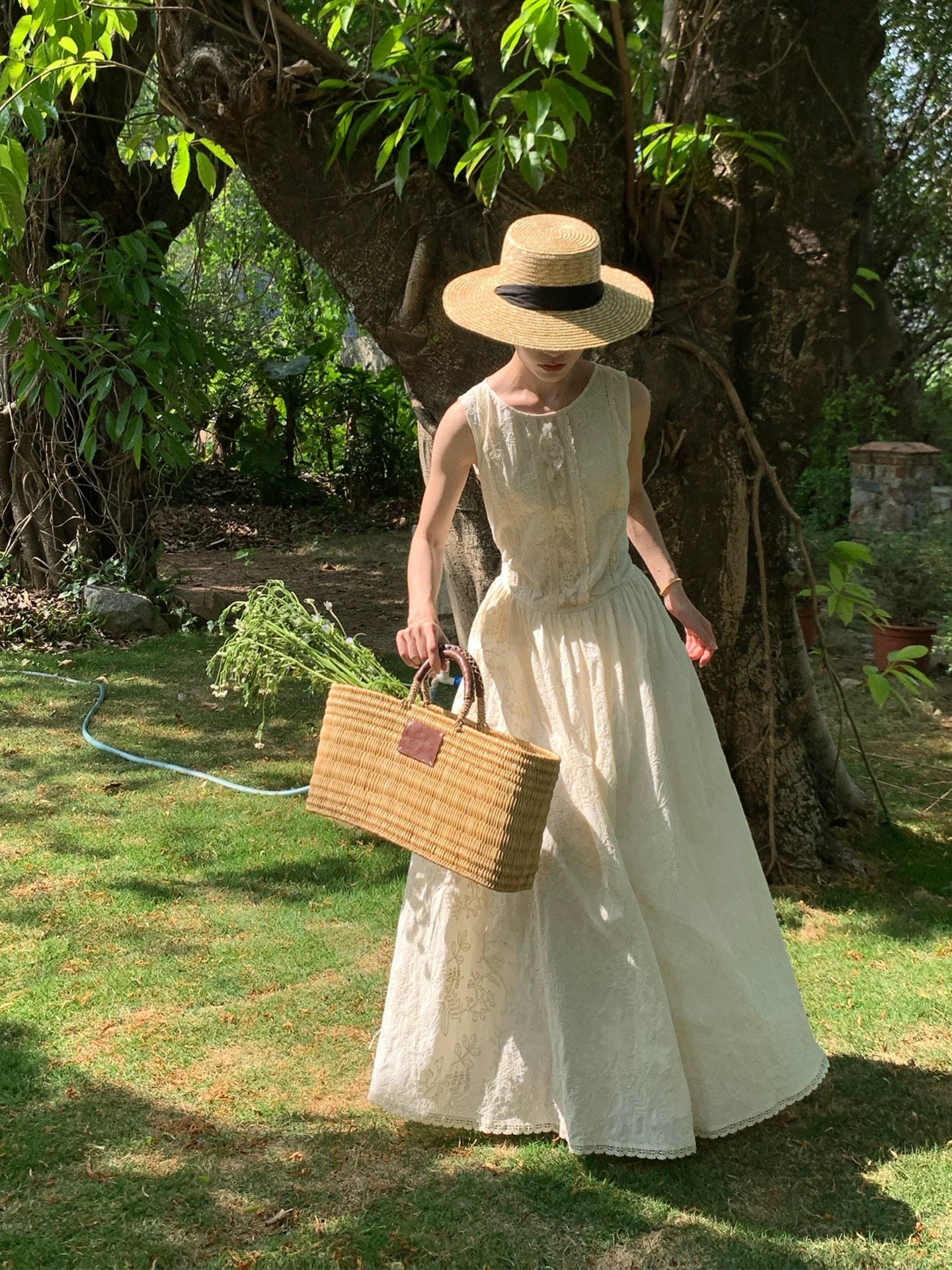 Three Tailors - Apricot Gauze Breeze - French Retro Heavy Embroidery Sleeveless Beautiful Dress for Women - Elegant Long Dress