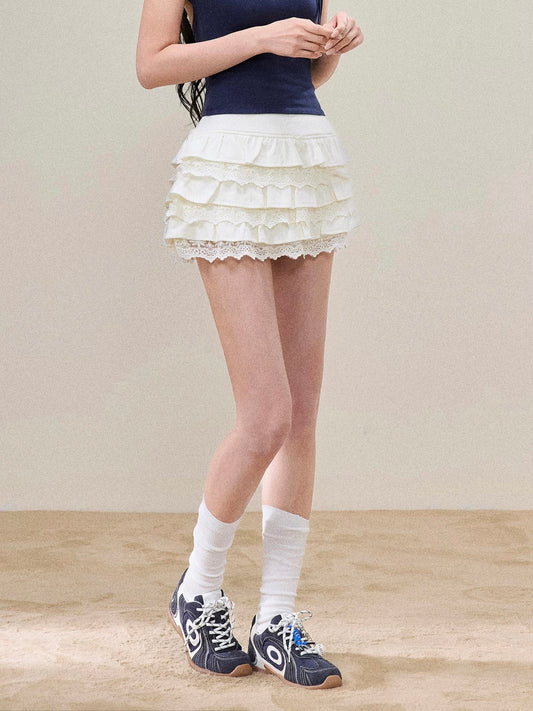 Sweety White Lace-Trimmed Layered Skirt for Women, Summer Slim Fit, Versatile Short Skirt, Cake Skirt