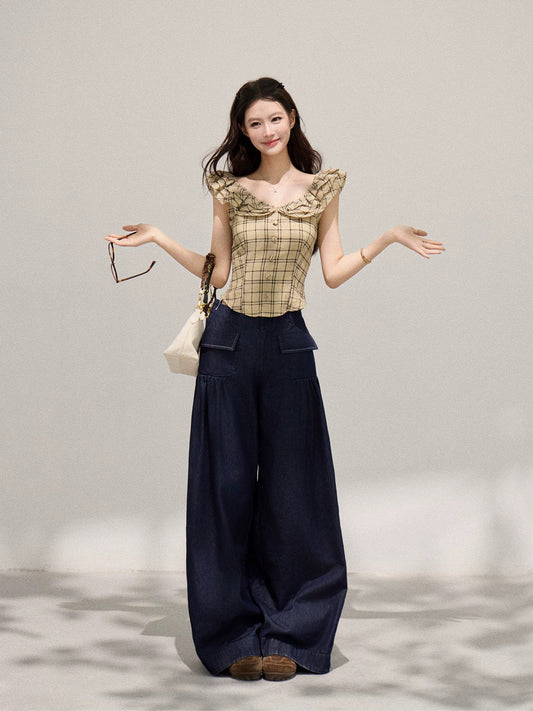 Xie Burou Tencel Off-Shoulder Double-Layer Ruffled Plaid T-Shirt Women's Spring Korean Style Fashion Slim Waist Short Top