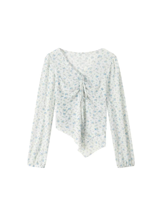 Xie Burou Irregular Floral Print Slightly Sheer V-Neck Ruffled Long-Sleeve T-Shirt for Women, Spring Style, Korean Casual Top